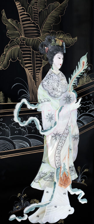 This room reminds me on a pagoda and of lotus flowers and dragons – chinese dragons. That is I have never been in china and certainly not in the past but my researches found out that chinese rooms must have had sumptious surroundings in palaces and we tried to recreate that. As it is the only room where we feature wallpaper it has its very own special ambience of indulgence the handpainted and outlayed black laquer furnitures have the theme of mother of pearl. With this ancient traditional approach we have been very proud of the end result. With a snug seating aera and a self designed ensuite with a steamshower to give our guests a little fun and luxury while showering we hope to whoever chooses this pagoda style room will have a good night sleep in far far away lands. This room is to the far side of our house and features its own entrance and a beautiful view from the seating towards Keel Lake and Slievemore.