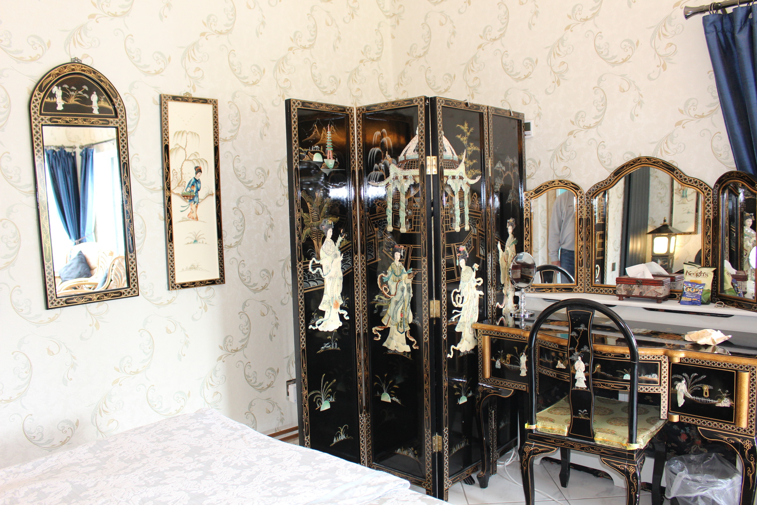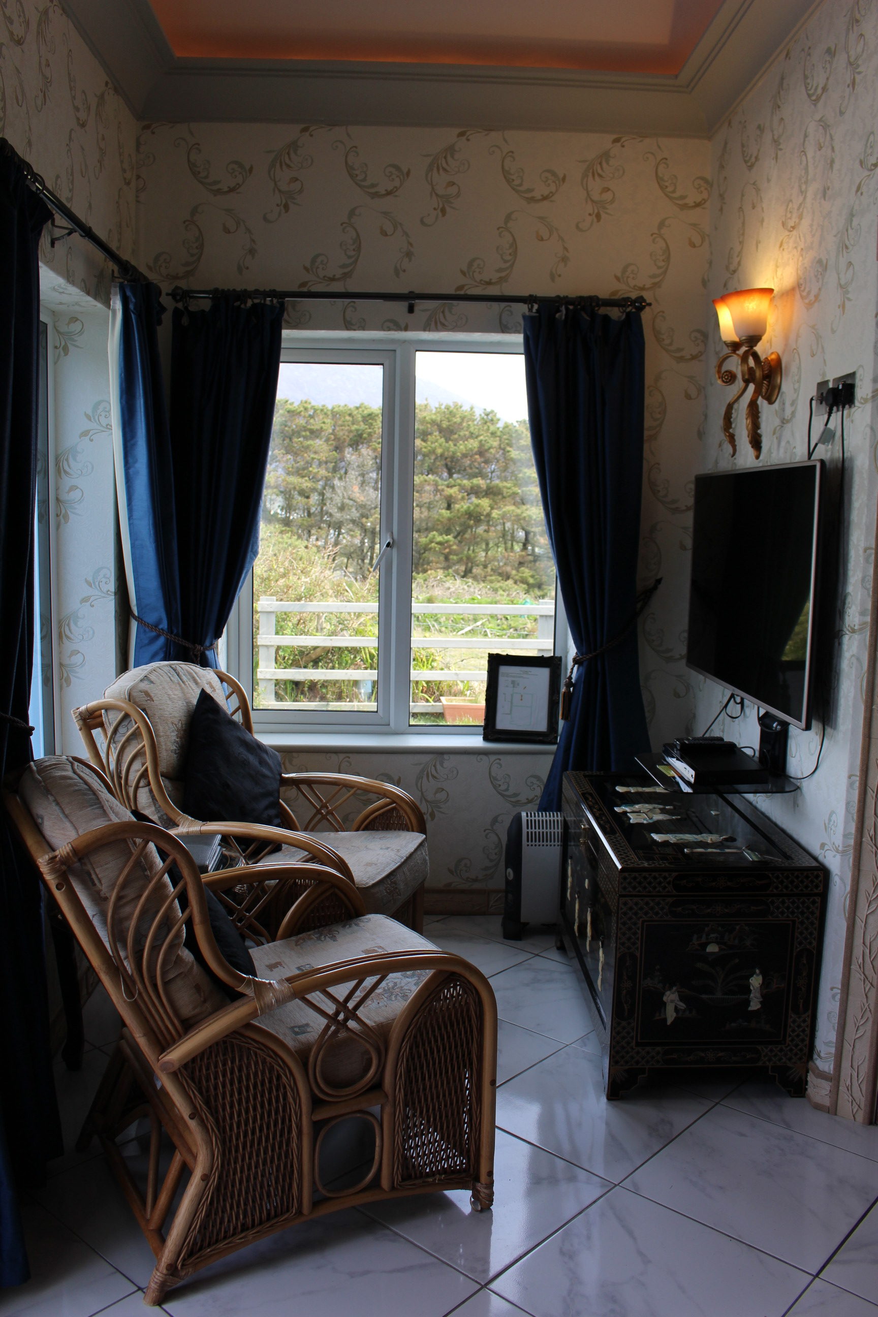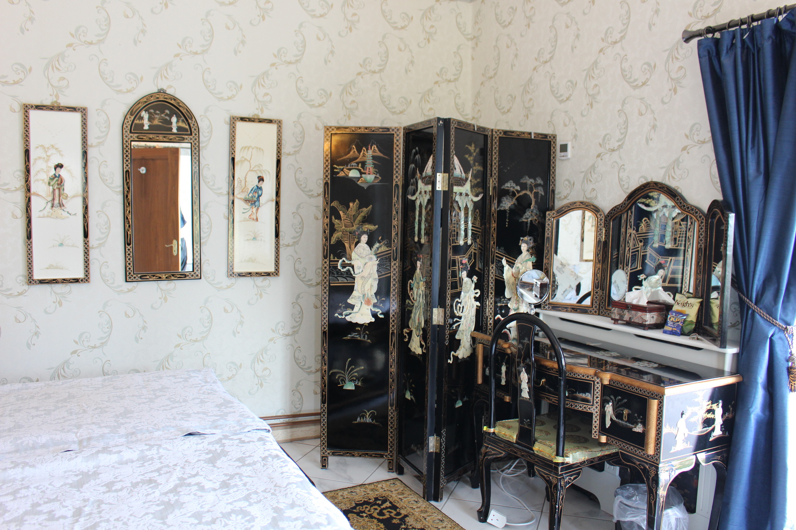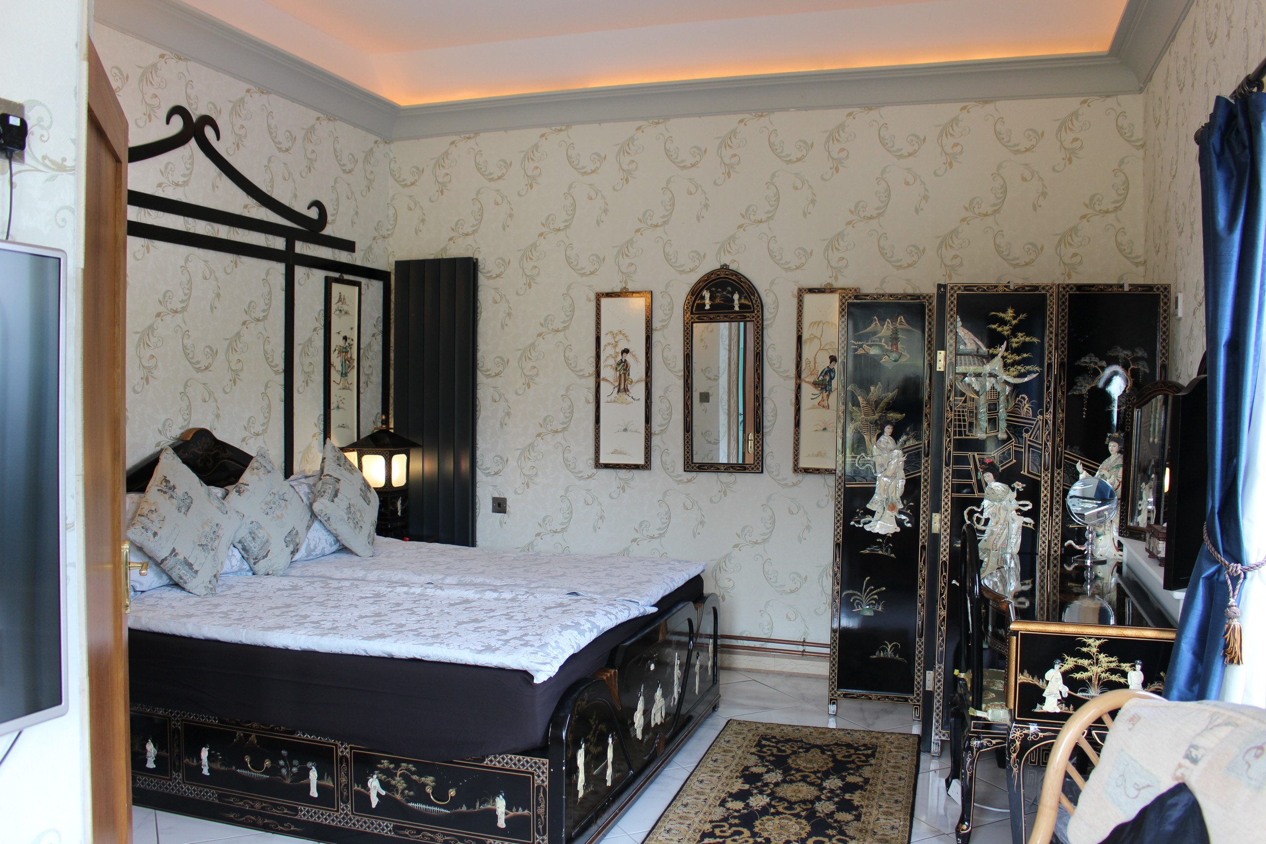 This room reminds me on a pagoda and of lotus flowers and dragons – chinese dragons. That is I have never been in china and certainly not in the past but my researches found out that chinese rooms must have had sumptious surroundings in palaces and we tried to recreate that. As it is the only room where we feature wallpaper it has its very own special ambience of indulgence the handpainted and outlayed black laquer furnitures have the theme of mother of pearl. With this ancient traditional approach we have been very proud of the end result. With a snug seating aera and a self designed ensuite with a steamshower to give our guests a little fun and luxury while showering we hope to whoever chooses this pagoda style room will have a good night sleep in far far away lands. This room is to the far side of our house and features its own entrance and a beautiful view from the seating towards Keel Lake and Slievemore.