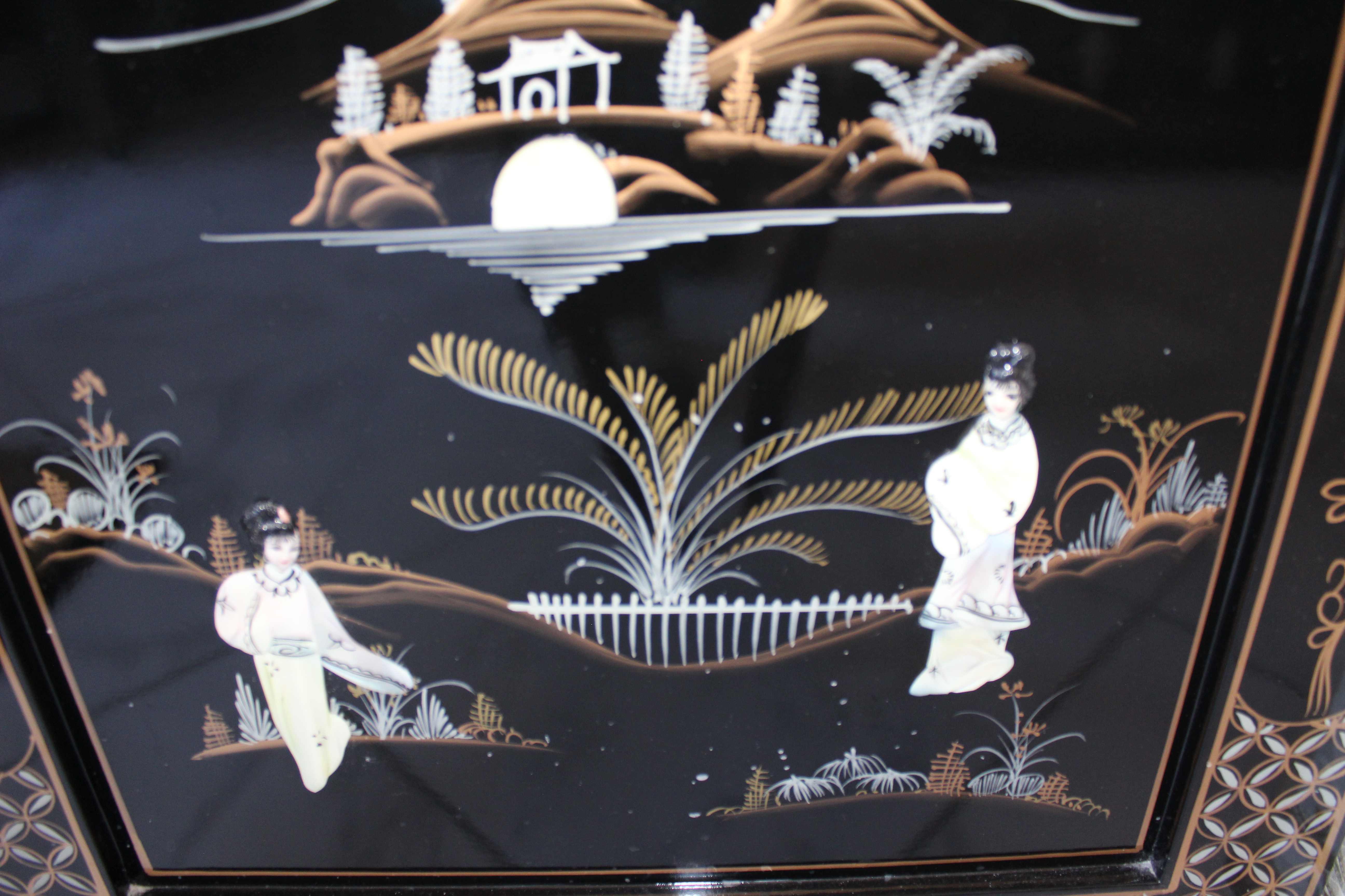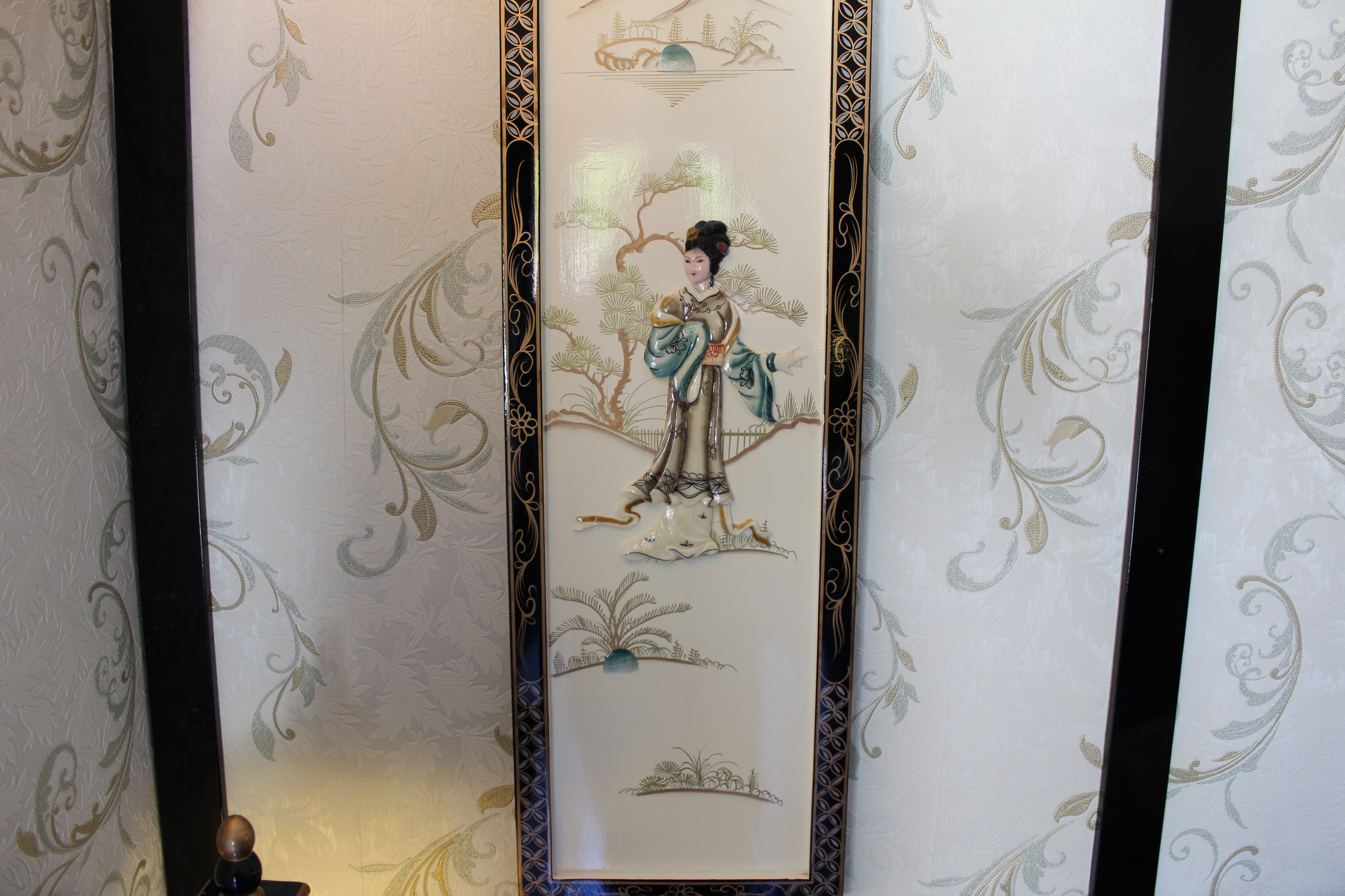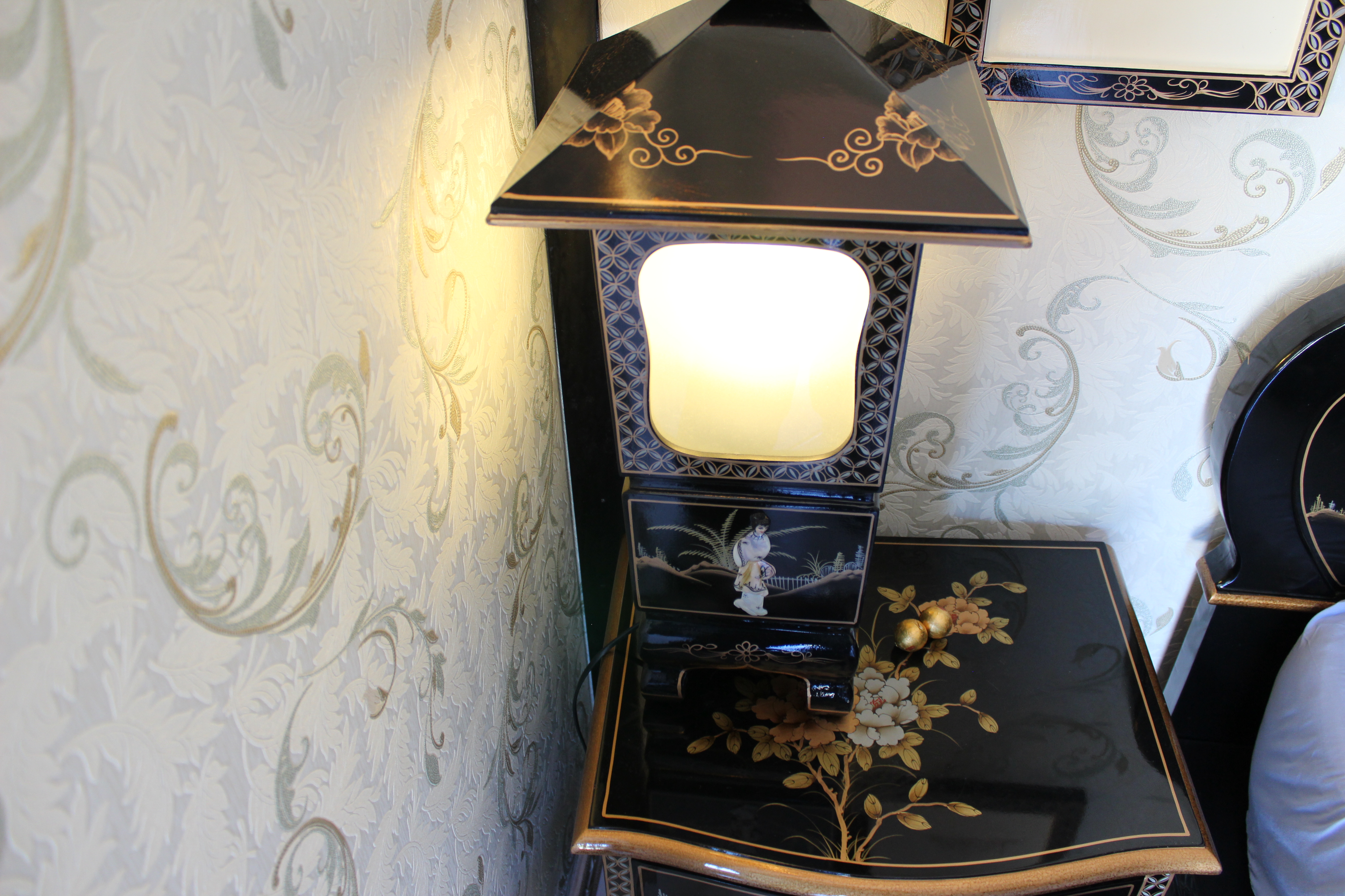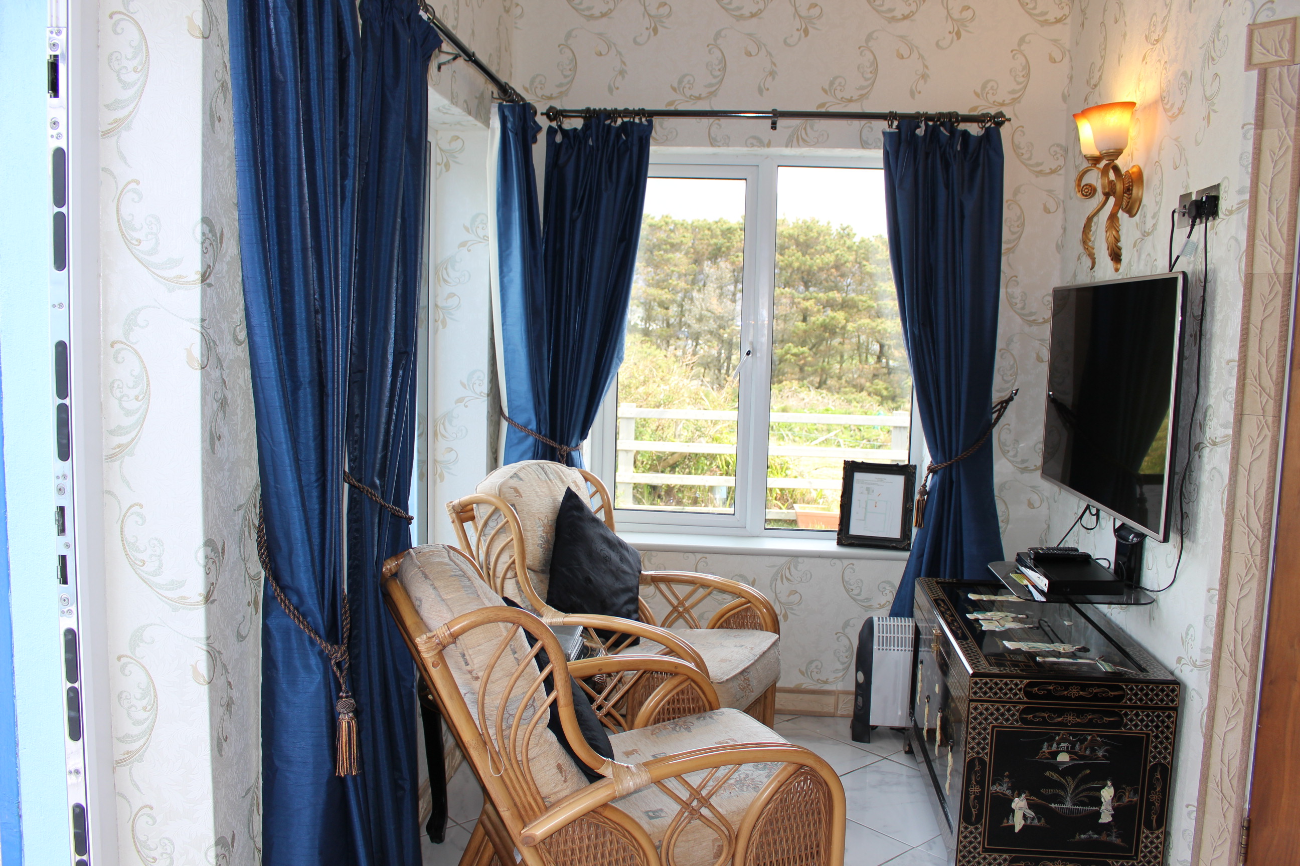 This room reminds me on a pagoda and of lotus flowers and dragons – chinese dragons. That is I have never been in china and certainly not in the past but my researches found out that chinese rooms must have had sumptious surroundings in palaces and we tried to recreate that. As it is the only room where we feature wallpaper it has its very own special ambience of indulgence the handpainted and outlayed black laquer furnitures have the theme of mother of pearl. With this ancient traditional approach we have been very proud of the end result. With a snug seating aera and a self designed ensuite with a steamshower to give our guests a little fun and luxury while showering we hope to whoever chooses this pagoda style room will have a good night sleep in far far away lands. This room is to the far side of our house and features its own entrance and a beautiful view from the seating towards Keel Lake and Slievemore.