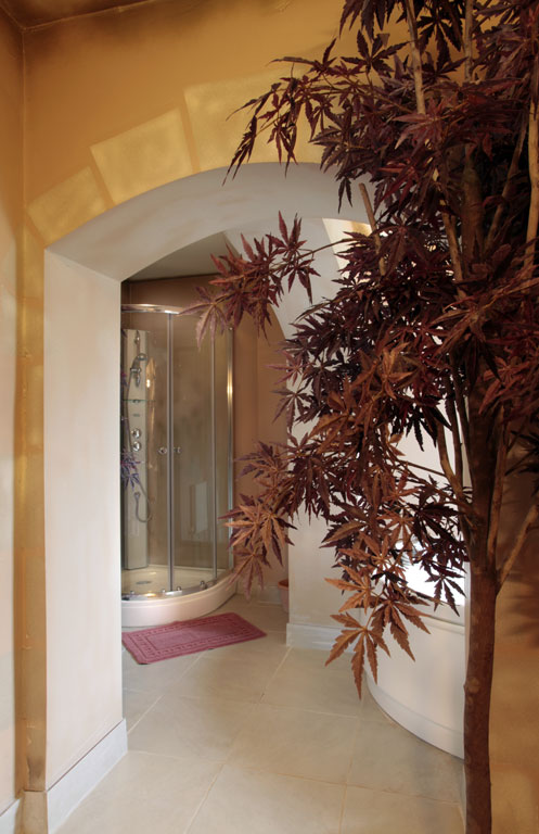 Hail Ceasar – I heard from a far and distant land long long ago. Our roman royal suite is to date our most elaborate suite yet with a new extension finished for 2016. Once you enter, an airy feel with space surrounds you. A half tester bed and the sheer luxury is all around you and one wonders would life in ancient rome be like the one we created in this huge space. The bathroom is a connection of three rooms and feature a jacuzzi bathtub and a shower and gives the feeling of being in the roman catacombs with its arches and niches. The newest addition but is the palaestra like seating aerea from where you can indulge into the landscape below and watching the waves and the sea the cliffs and the land beyond one can only visualize how maybe ancient rome must have felt as an aristocrat in ancient times.