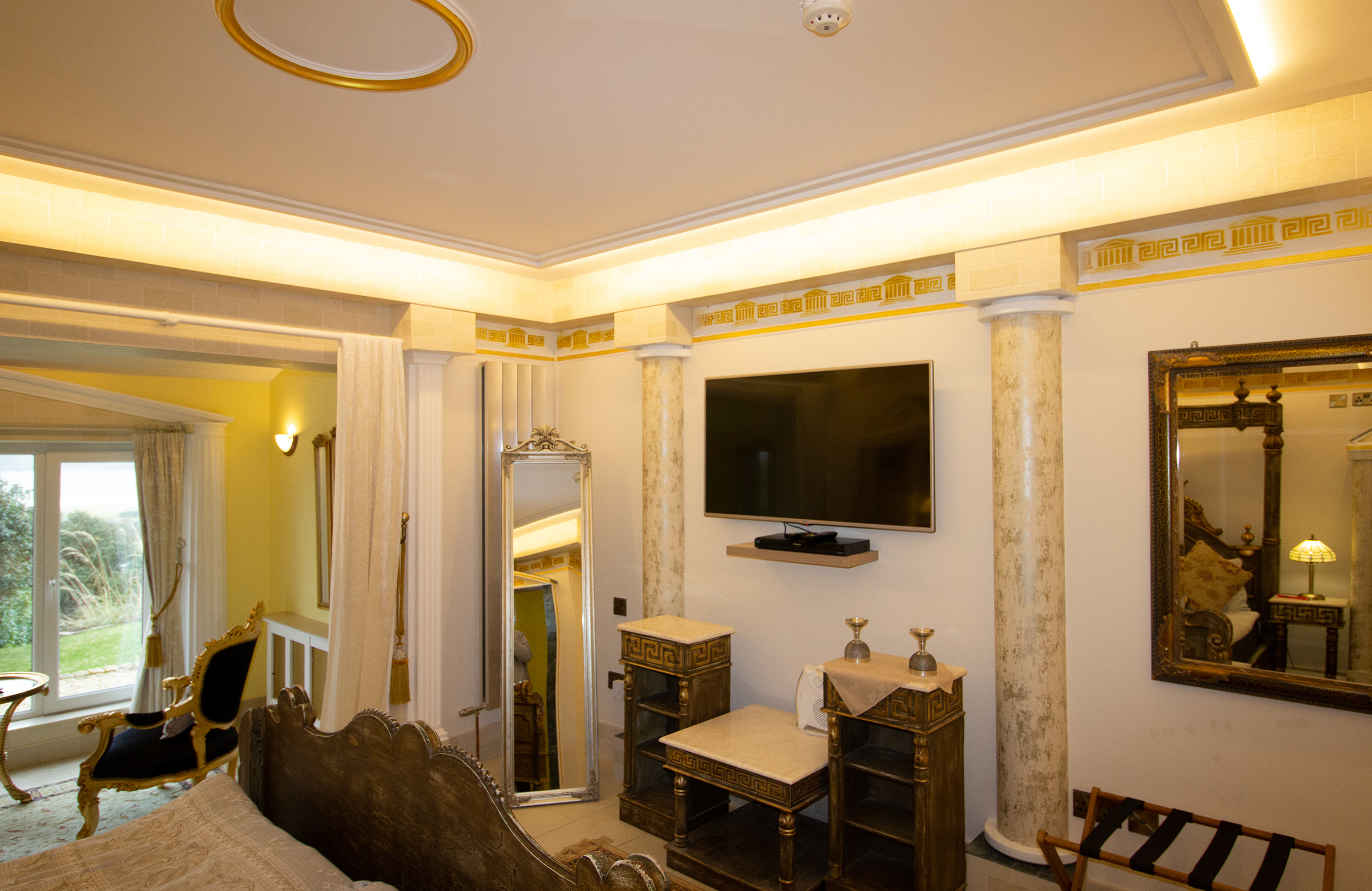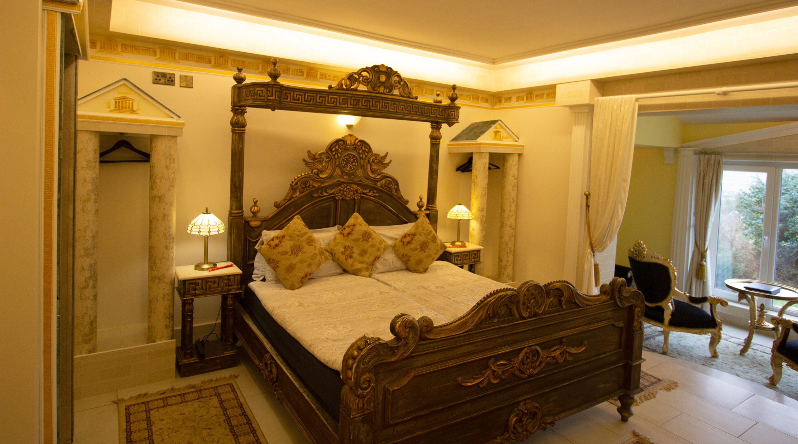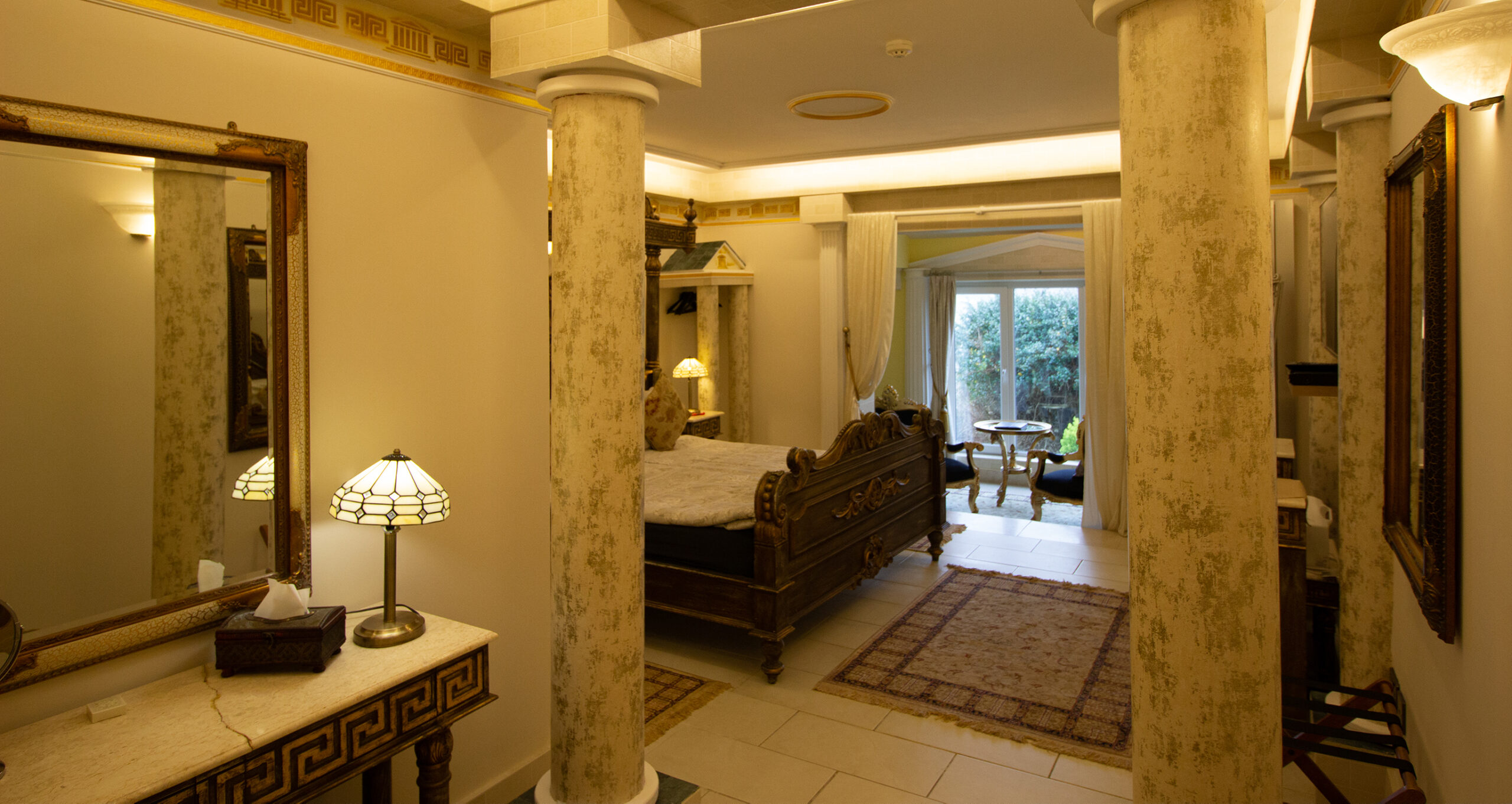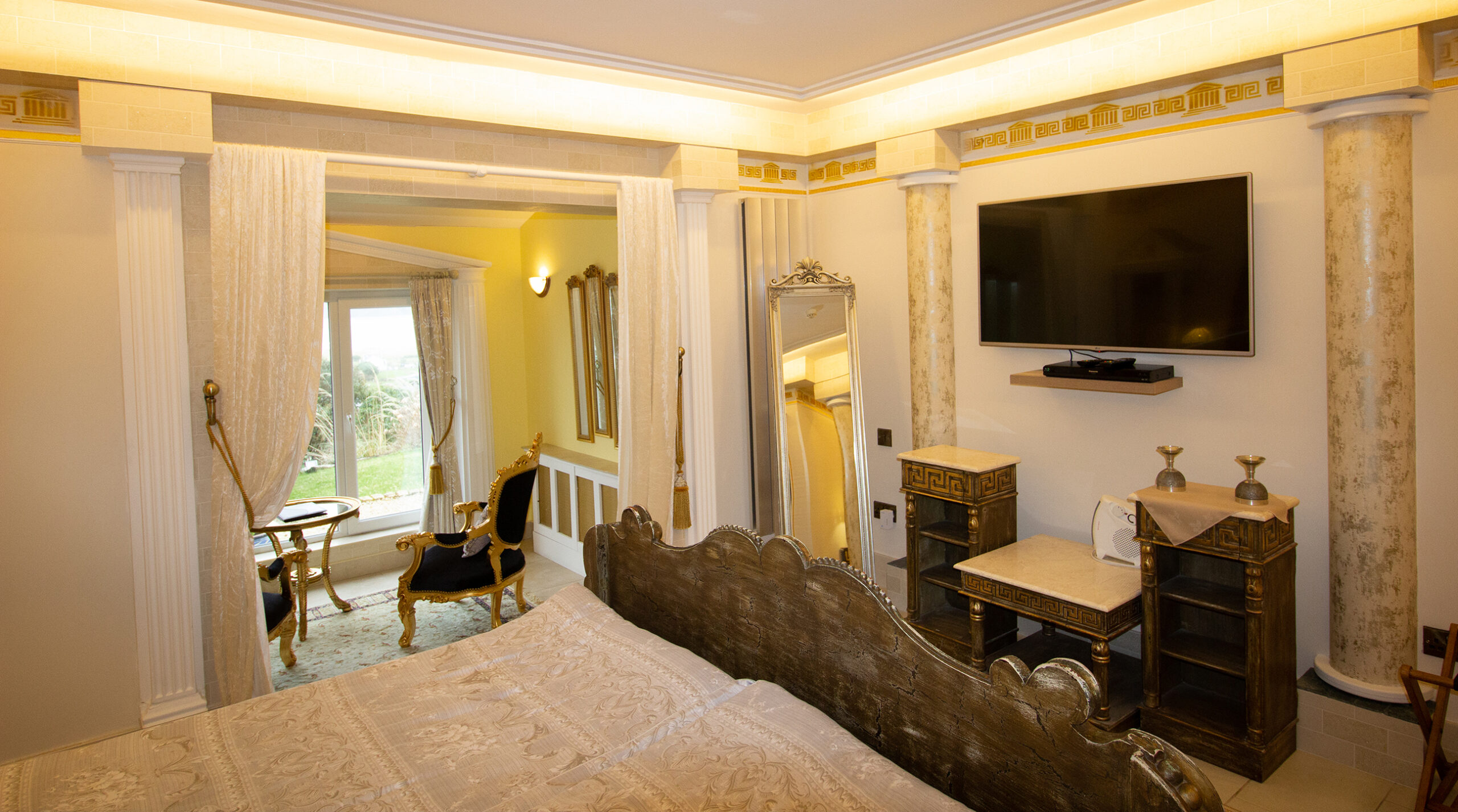 Hail Ceasar – I heard from a far and distant land long long ago. Our roman royal suite is to date our most elaborate suite yet with a new extension finished for 2016. Once you enter, an airy feel with space surrounds you. A half tester bed and the sheer luxury is all around you and one wonders would life in ancient rome be like the one we created in this huge space. The bathroom is a connection of three rooms and feature a jacuzzi bathtub and a shower and gives the feeling of being in the roman catacombs with its arches and niches. The newest addition but is the palaestra like seating aerea from where you can indulge into the landscape below and watching the waves and the sea the cliffs and the land beyond one can only visualize how maybe ancient rome must have felt as an aristocrat in ancient times.
