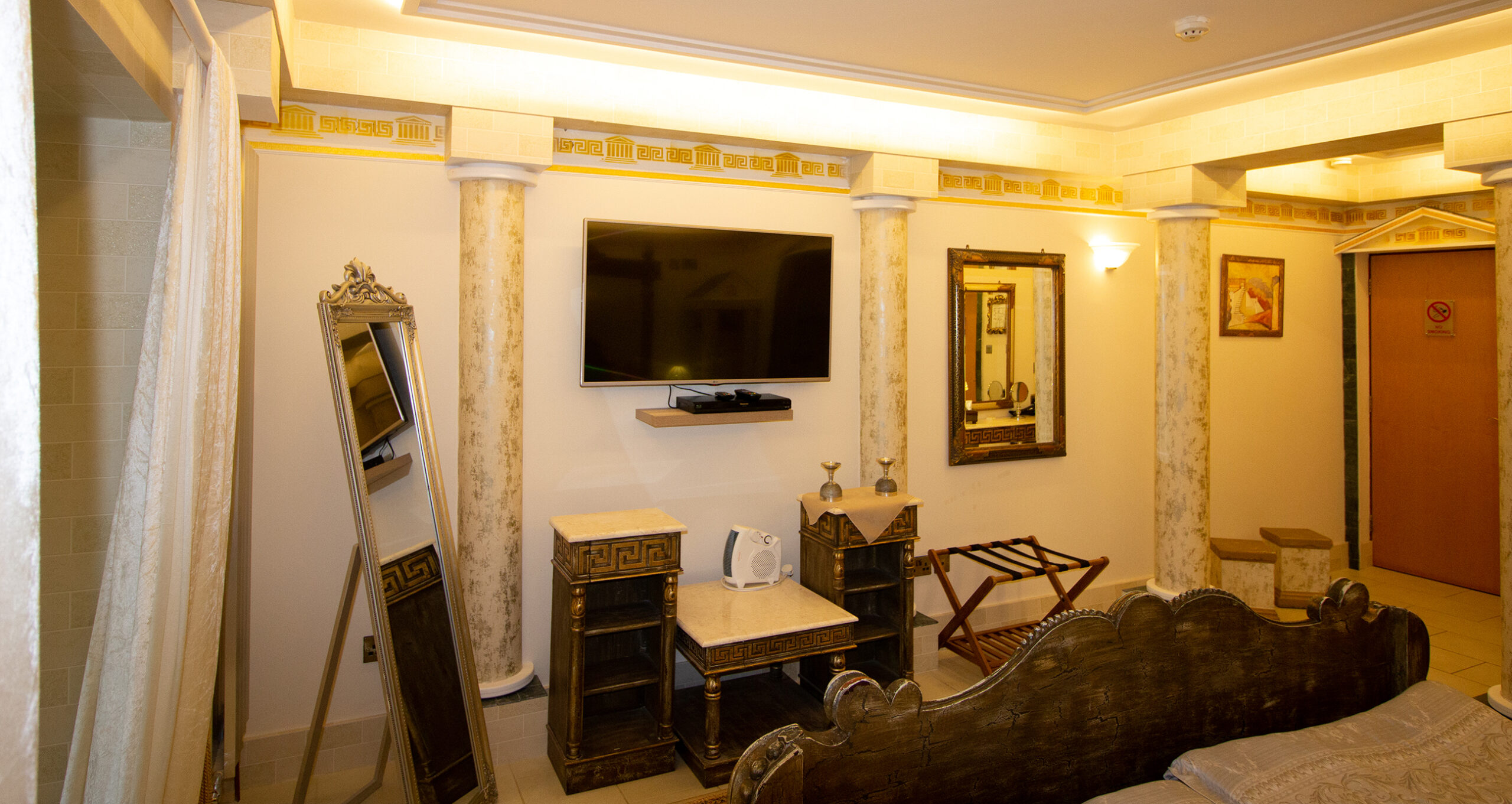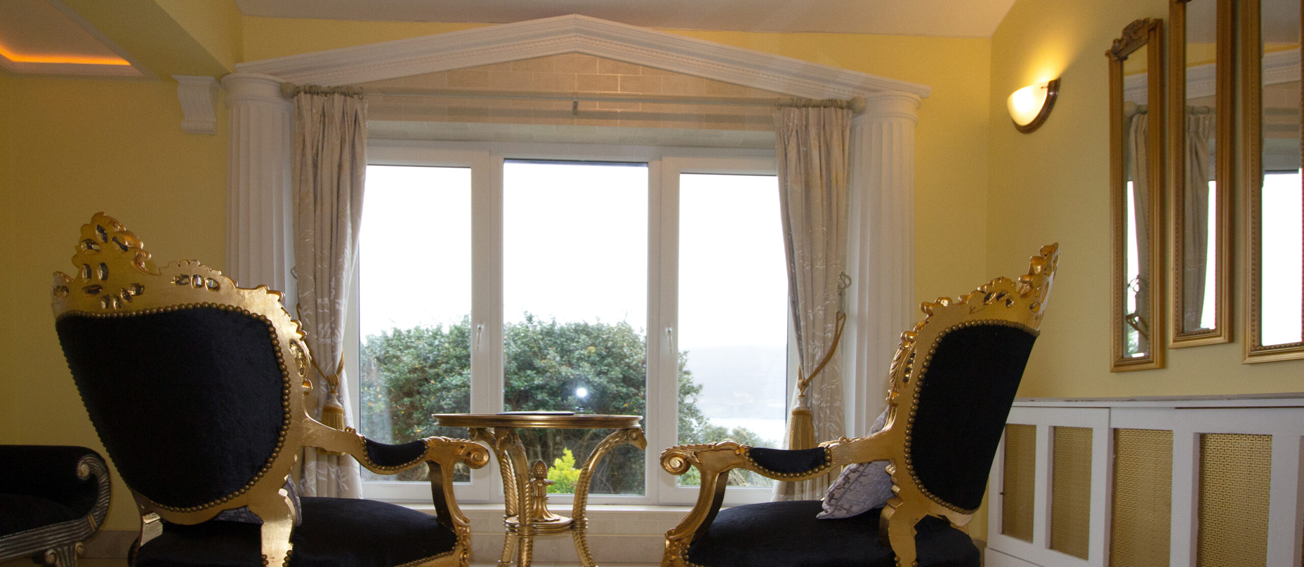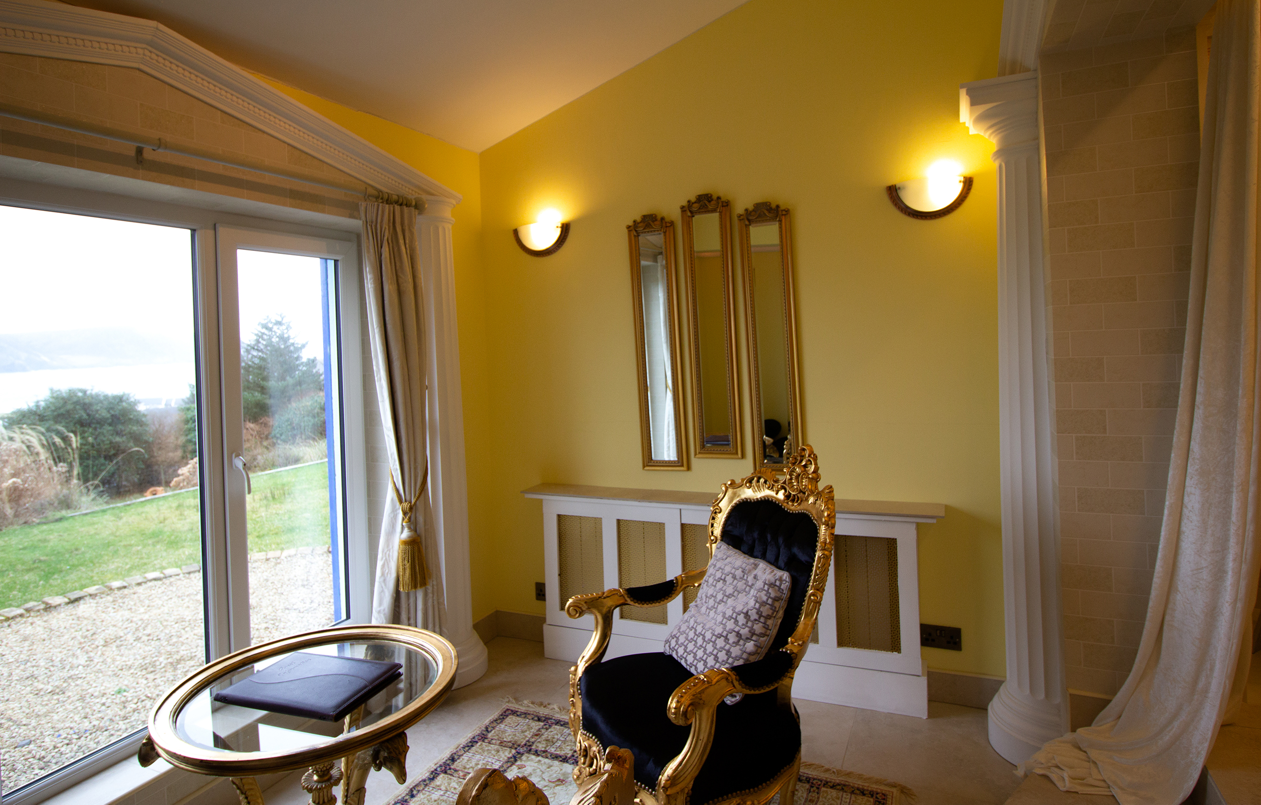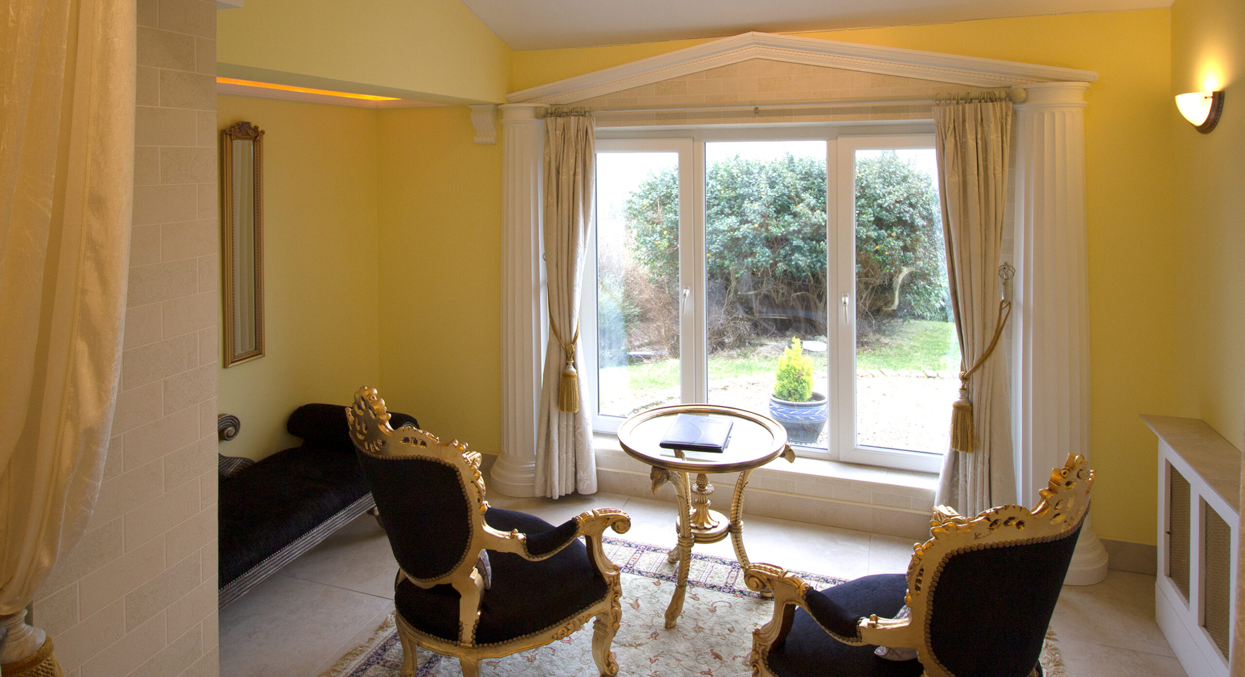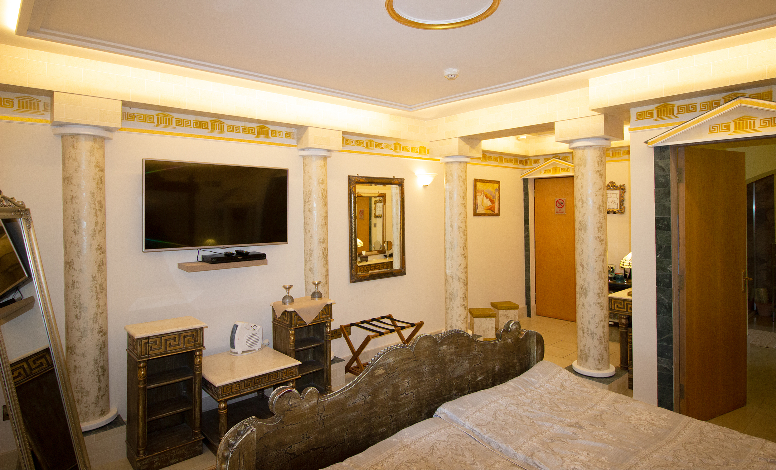 Hail Ceasar – I heard from a far and distant land long long ago. Our roman royal suite is to date our most elaborate suite yet with a new extension finished for 2016. Once you enter, an airy feel with space surrounds you. A half tester bed and the sheer luxury is all around you and one wonders would life in ancient rome be like the one we created in this huge space. The bathroom is a connection of three rooms and feature a jacuzzi bathtub and a shower and gives the feeling of being in the roman catacombs with its arches and niches. The newest addition but is the palaestra like seating aerea from where you can indulge into the landscape below and watching the waves and the sea the cliffs and the land beyond one can only visualize how maybe ancient rome must have felt as an aristocrat in ancient times.